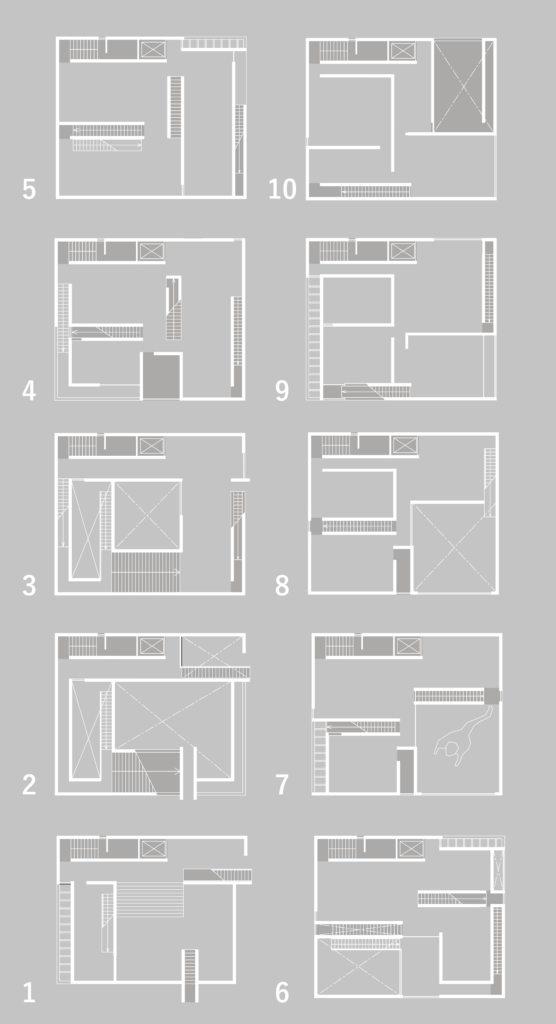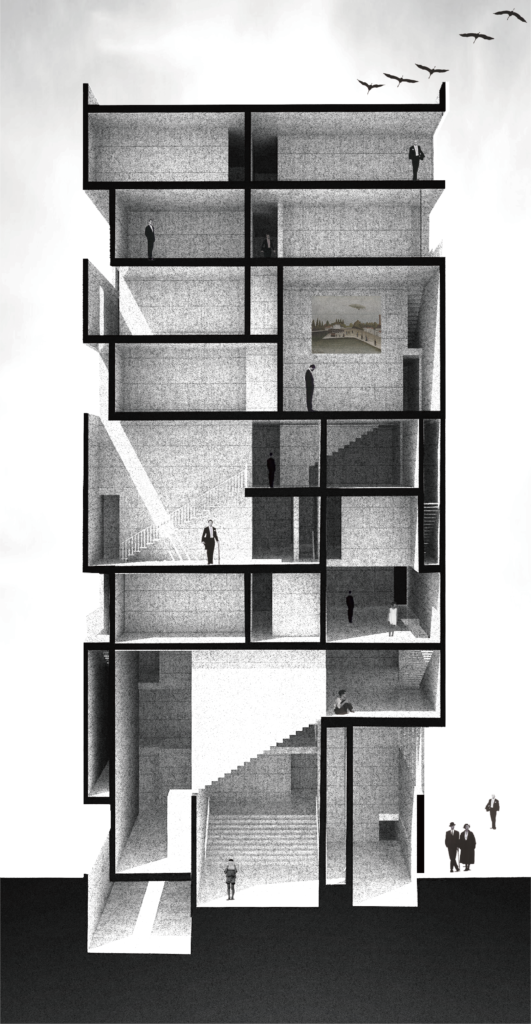 この不透明性を建築の操作として定義し、「立体的なプログラムの再編成」と「内外転倒による空間構成」によって、複数のプログラムが重層する都市型複合ビルのプロトタイプを提案した。
