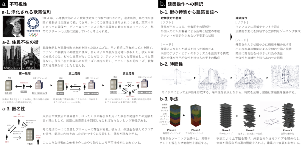本計画は新宿区歌舞伎町に複合ビルを計画する架空のプロジェクトである。歌舞伎町の不透明な都市構造に着目し、都市に潜在する空間論理を読み解くことで、建築の形式として再構成した。