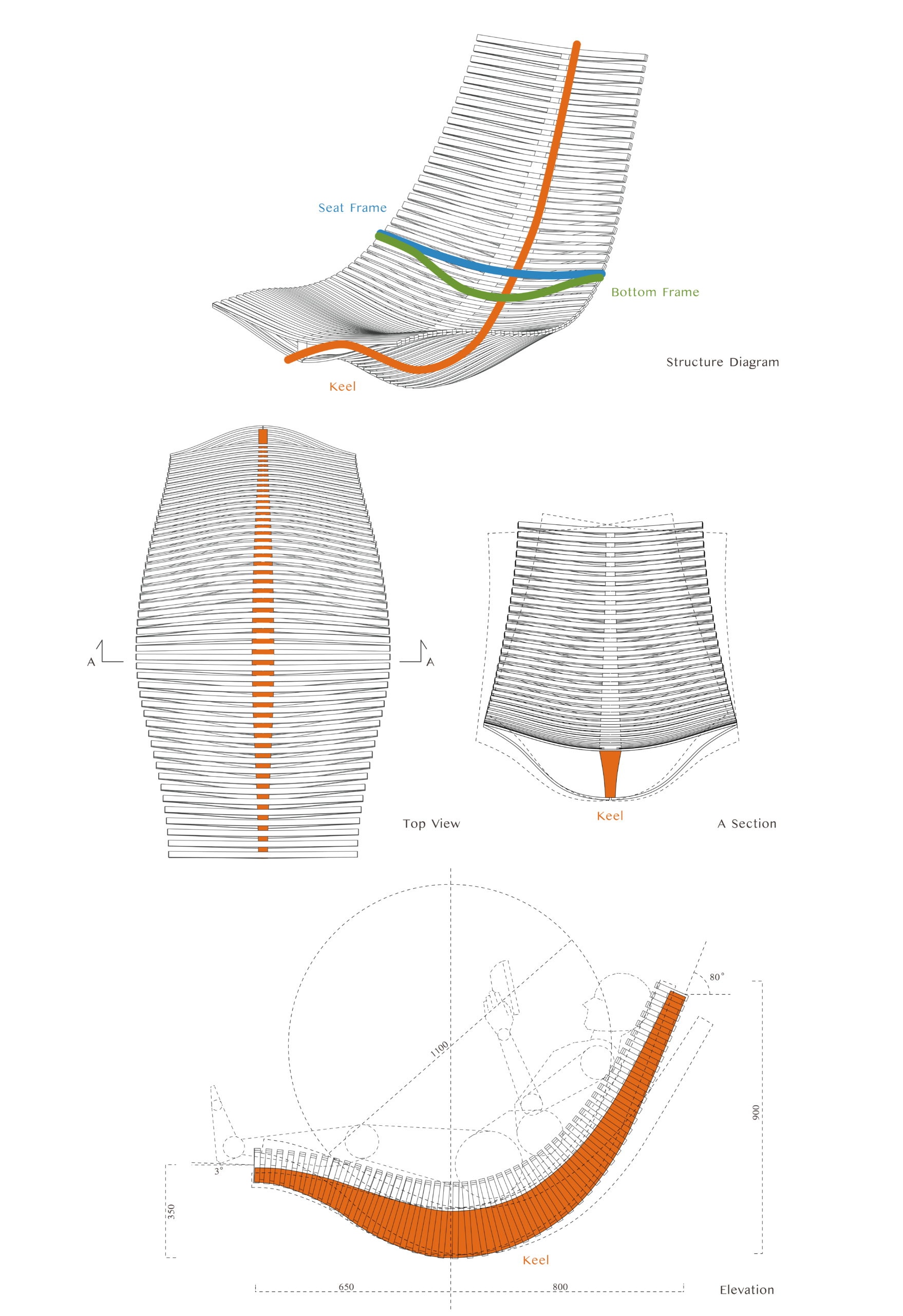 船舶の構造材として用いられる「竜骨(キール)」に着想し、身体を預けられる椅子を提案した。中央に通るキール構造が、椅子全体のしなやかな曲面と強度を両立させ、波の上をたゆたうような座り心地を生み出す。加工しやすく、美しい曲げ木の質感を持つオーク材を用い、精密な切断と構成によって有機的かつ幾何学的な造形を形成した。